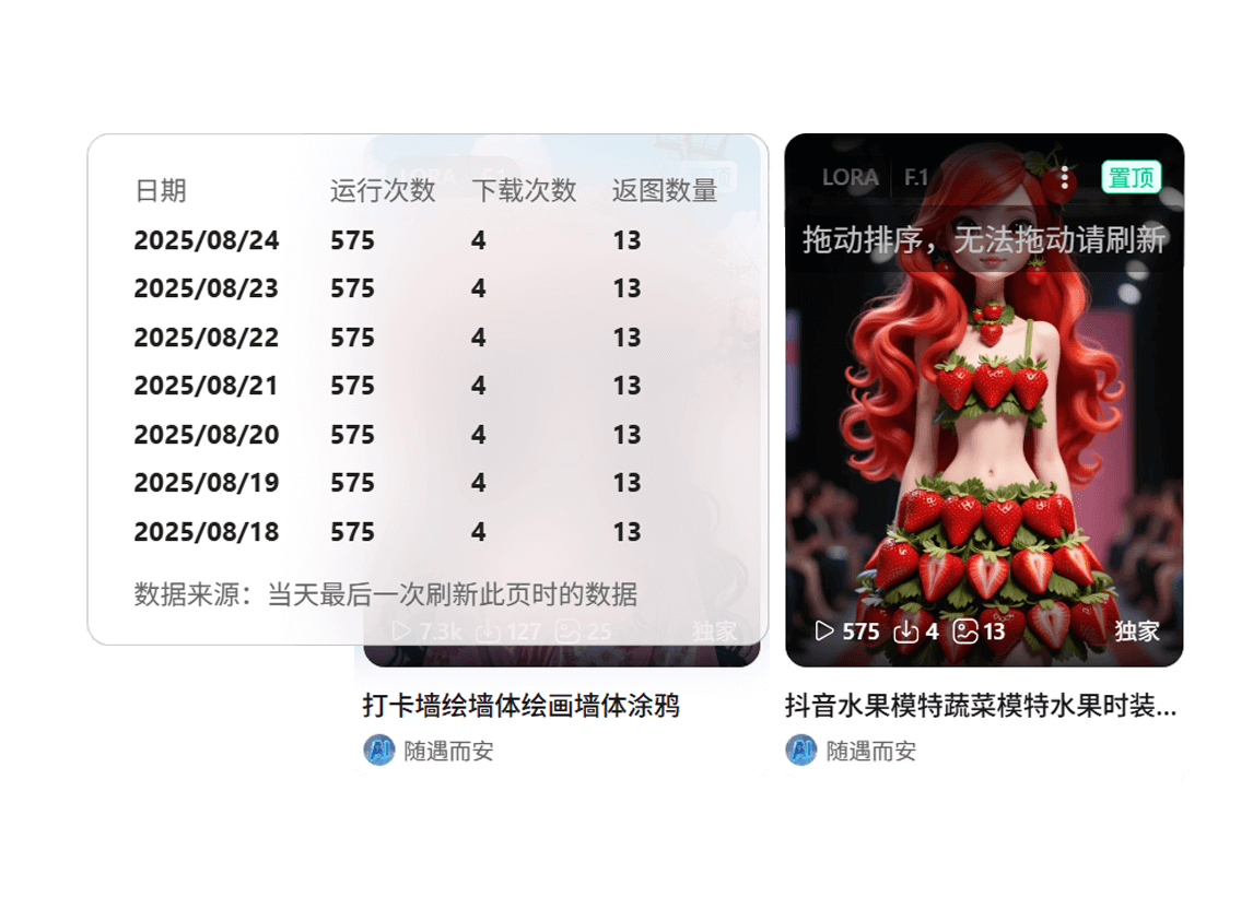展示哩布AI最近7天模型、工作流详细数据